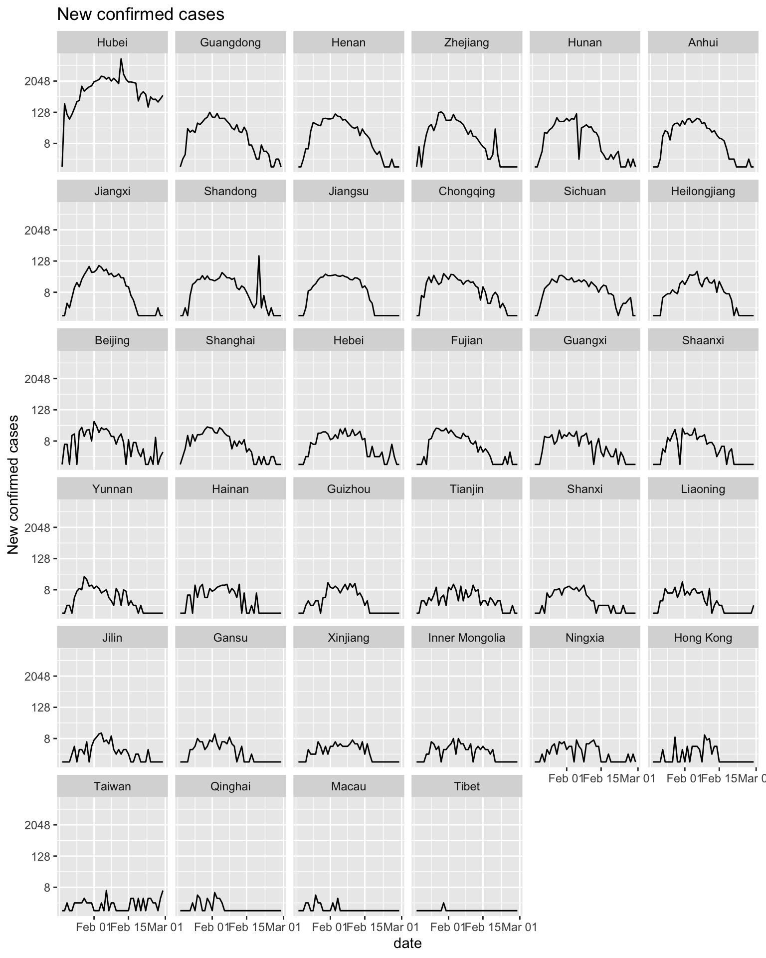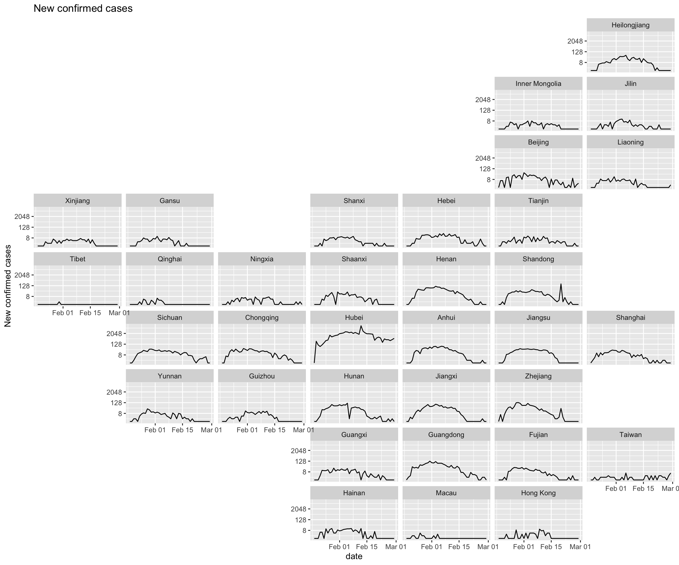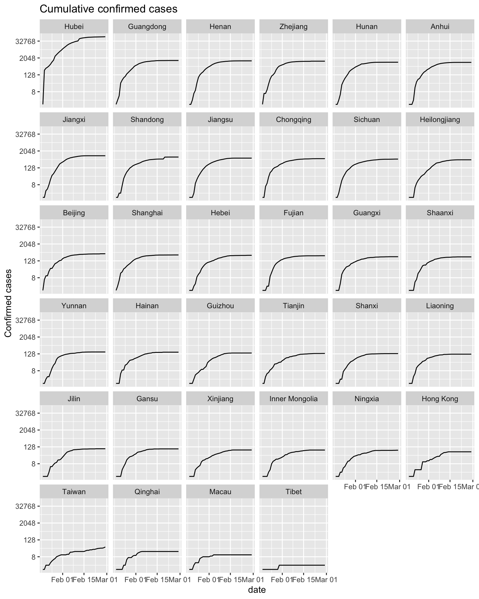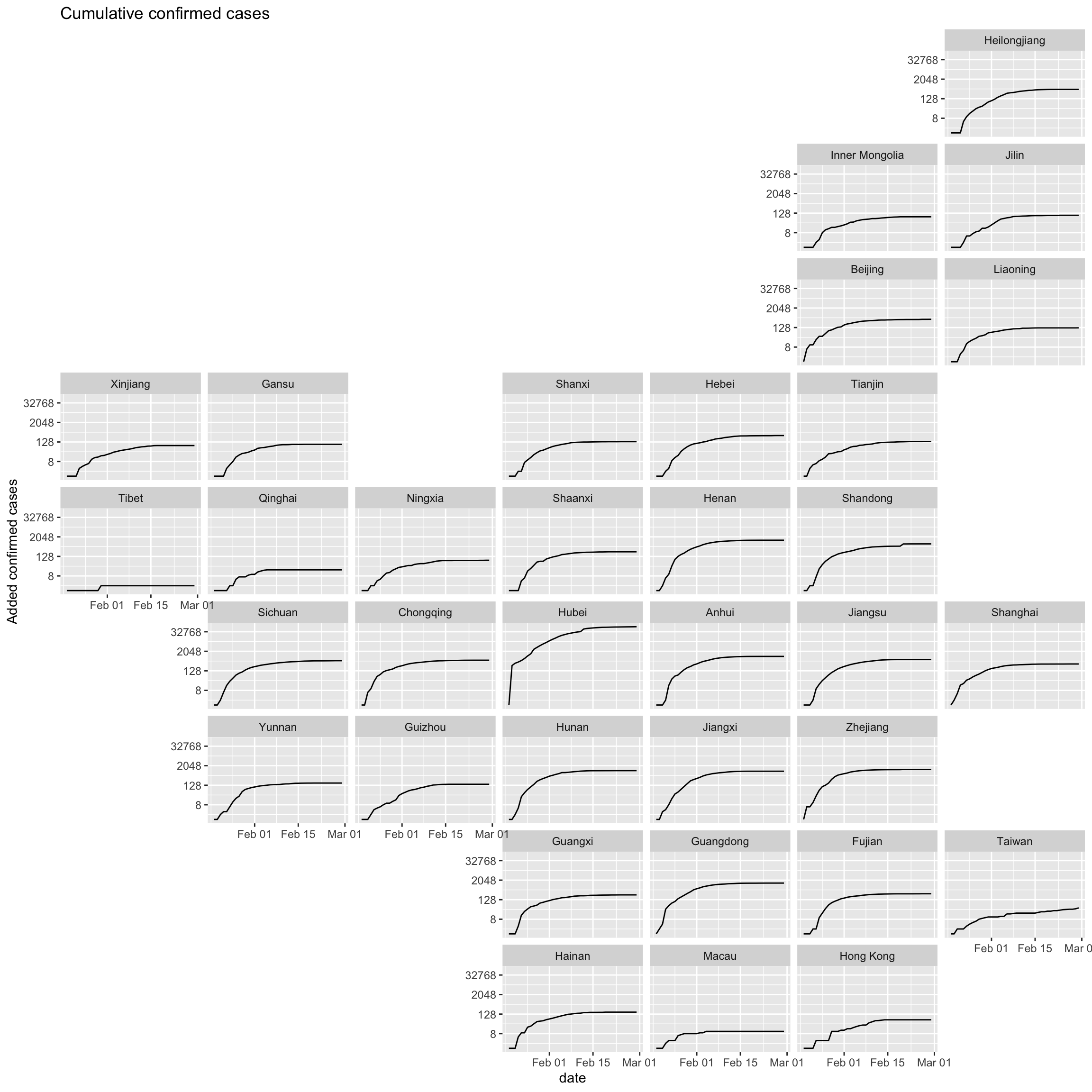 Regarding the cumulative confirmed cases data, we plot two line graphs. The difference between them is the arrangement of facets. The first graph is arranged according to geographic location. The second graph is arranged in descending order of the number of confirmed cases of each province.