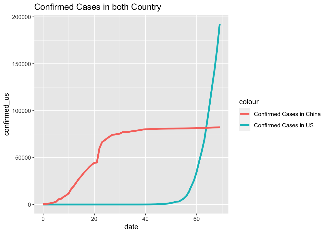 geom_line(aes(y = confirmed_us, colour = "Confirmed Cases in US"), size=1.3) +